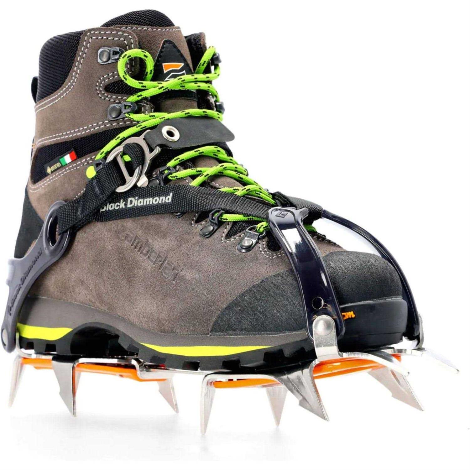 Compact and easy to use, the 10-point Black Diamond Contact strap-on crampons are optimized for general mountaineering, backcountry skiing and glacier walking. Now constructed using stainless steel for a design that won’t rust, crampons are lighter weight and more durable than previous version; stainless steel resists snow balling. Low profile creates a secure connection to modern climbing boots. Horizontal front points provide excellent stability on snow and glaciers. Secondary points create a stable platform while kicking steps; serrated points bite into snow and ice for secure hold. Flexible toe straps fit most footwear. Included dual-density ABS plates keep snow from sticking beneath your feet. Boots size 12 and larger require the Long Center Bars, sold separately.