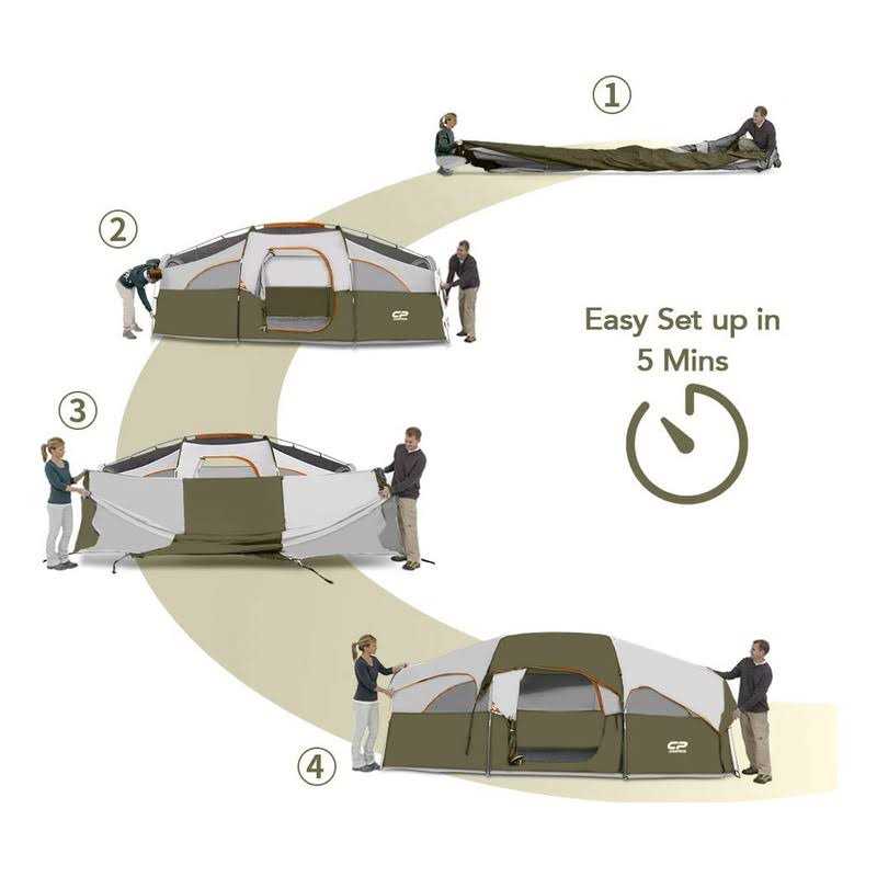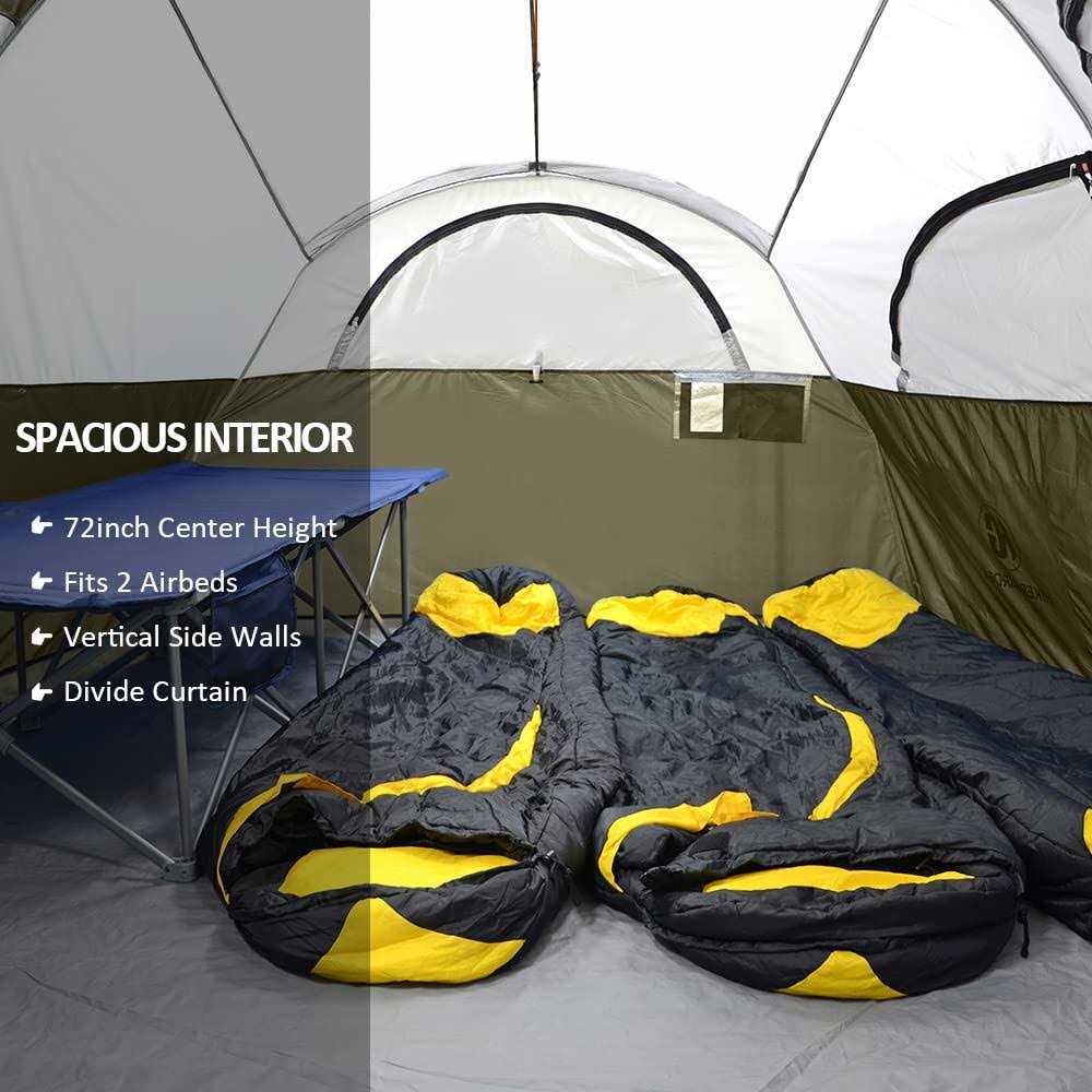 Polyester Imported ROOMY INTERIOR: Straight wall design with 72in center height create more space to stand up changing and move. WEATHER PROTECTION: High-tech coating material with sealed seams and waterproof strip guarantees water-resistant. EASY SETUP & COLOR COATED POLES: No particular skills needed, 2 people could set up the tent easily in 5 min. GREAT VENTILATION: Mesh tent top and doors offer great views and ventilation. 2 ROOMS: A separated curtain can be used as room divider and projector screen.