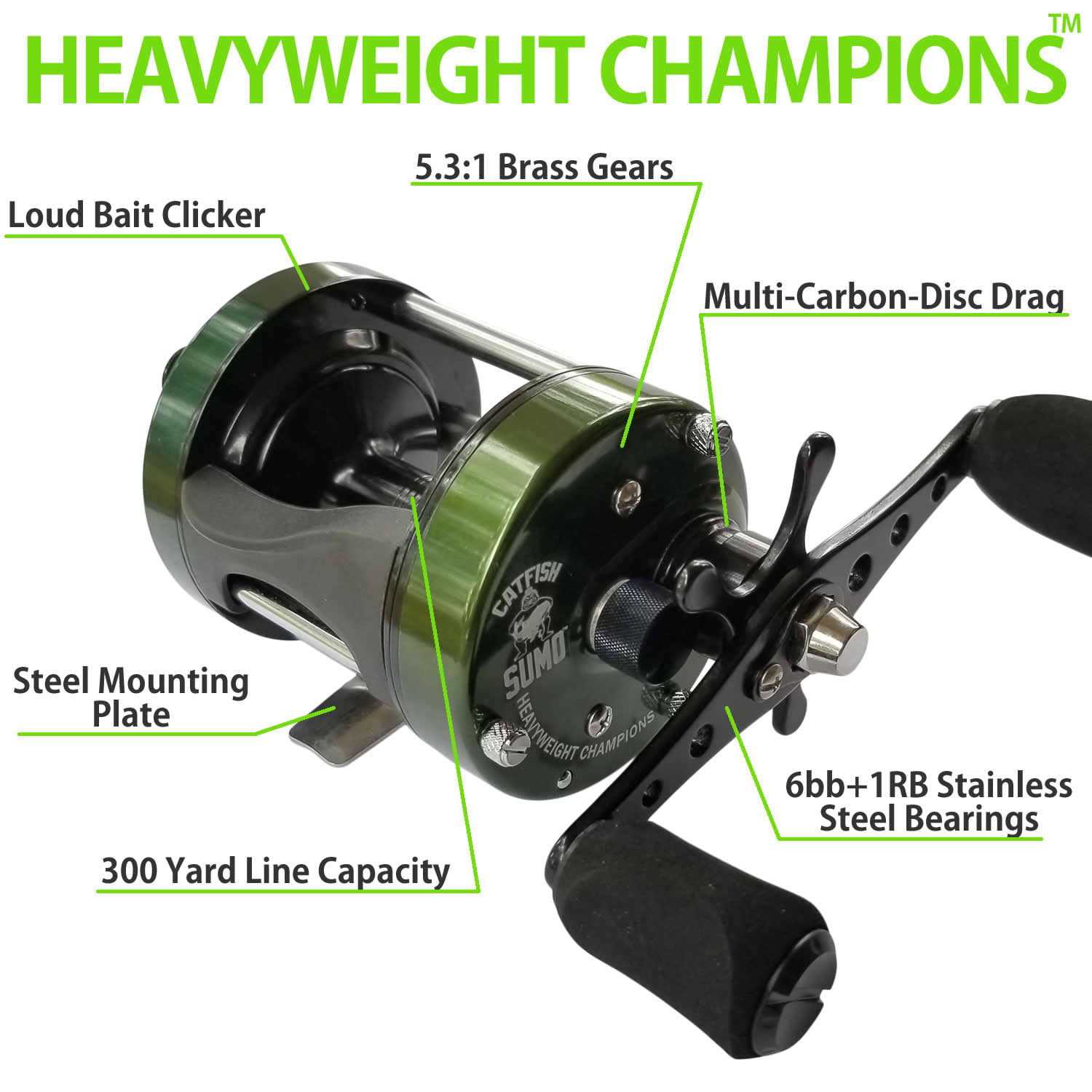 FISHING REEL MADE FOR CATFISH: Catfishing is tough on gear. Rock banks, in and out of boats, sometimes in the dark, and fighting beasts that can take your tackle to task. The Catfish Sumo Heavyweight Champions Reel is made with ultra-high quality components, and has features specifically designed for fighting trophy cat fish, while still making it fun for smaller fish. Youll be able to easily cast the distance. Centrifugal Brake System + spindle brakes help prevent a giant birds nest. Then click the Anti-Reverse anywhere to kick in your drag. FEATURES: Loud Bait Clicker, Steel Ball Bearings (6bb+1RB) for smooth retrieve, Carbon Disc Drag with 20lbs of smooth drag can wear out even the toughest flathead catfish, 5.3:1 Brass Gears wont give out when fighting monster fish STRONG CONSTRUCTION: Steel Mounting Plate, Thickened aluminum sides can take abuse, metal gears wont melt down. Holds 300 yards of line at .35mm line diameter. Saltwater approved.