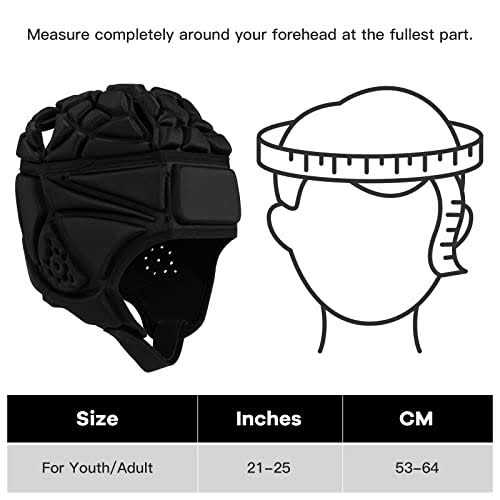 Security and High Performance Soft football helmet string in the back of the padded headgear is made of high quality material which is elastic, very strong and not easy to break, durable to use. The press buckle on the back string, it let you wear the rugby headguards by yourself more quickly and firmly. Adjustable Velcro The adjustable chin strap of this soft helmet rugby headguard covers a big area of the Velcro, which has excellent stickiness and not easy to loosen during sports, can be worn stably, let you focus more on your sports, it can also resistant to tearing and durable to use. High Elasticity EVA Material The soft shell helmet for flag football is made of impact resistant EVA foam, can effectively responds to various sports collisions, protects the head from injury, and the shape of the padded helmet design fits different head curves more closely, can wear firmly without moving. Multi Sports Head Protector The padded rugby cap has effective fall protection and is not only suitable for various outdoor sports, such as national flag football, rugby, football, surfing, 7V7, lacrosse, ice hockey, skateboarding, roller skating, Brazilian Jiu Jitsu, wrestling, mountain bike racing, martial arts, etc, also suitable for patients with epilepsy, fainting, autism, adults and children can choose. Breathable Headgear This soccer headgear is equipped with multiple air vents to discharge heat and moisture during exercise, which is beneficial to keep the head dry.Please refer to the size chart in the photo section. L 21 23 inches (54 58cm) Suitable for people over the age of 12.