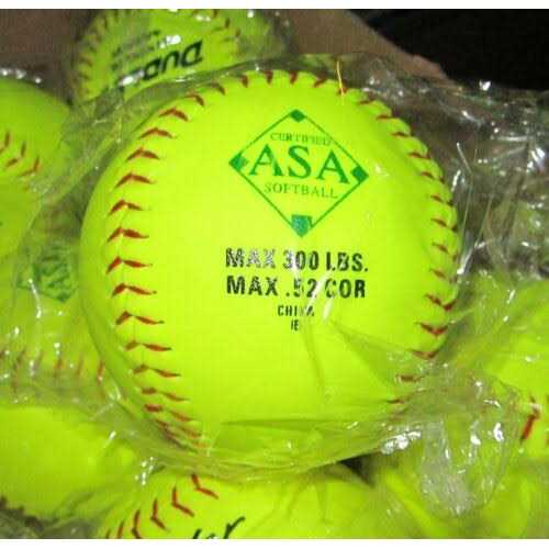 Hit it out of the park in the Dudley ASA Leather Slowpitch Softball. This ball features a precision blended crosslinked polyurethane system that improves ball durability, reduces bat damage, and reduces bat vibration “sting” on contact. It is built with a unique gluing process that bonds the cover to a poly core. The covering is composed of quality optic yellow synthetic with red stitching. 52 COR. 300 lbs. compression.