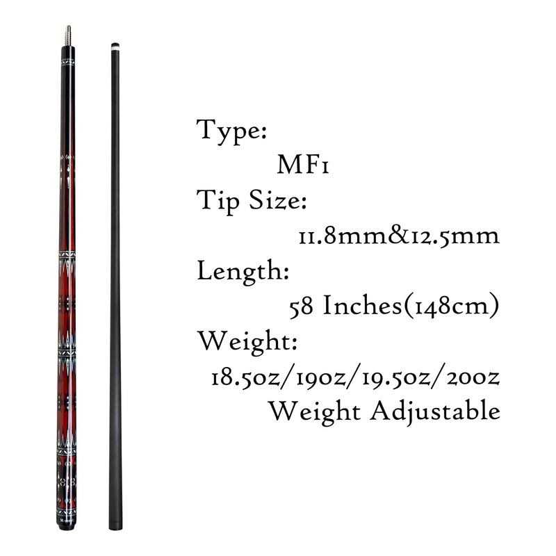Brand:MoyerelyColor:MF1-11.8mmFeatures:[Carbon fiber pool cue shaft]11.8mm/12.5mm low deflection carbon fiber shaft,the lightweight shaft produces a lower deflection rate than most advanced wood shafts[Durable]The carbon shafts are dent,warp,and scratch-resistant,they are also waterproof and not require as much maintenance as the time comes[A+ Canadian Maple]Canadian Hard Maple butt,better energy transfer[0.19 Inch Sighting Ferrule]Aid you hit your ball accurately,with professional multi-layer tip[Hard Cue Case]The cue stick come with a quality billiard cue case which was made of woodDetails:The Moyerely Carbon Fiber Pool Cue is a professional-grade cue stick that delivers exceptional performance on the pool table. With its 11.8mm/12.5mm low deflection carbon fiber shaft, this cue offers a lower deflection rate compared to traditional wood shafts, allowing for more precise and accurate shots. The carbon fiber construction also makes it highly durable, as it is dent, warp, and scratch-resistant, ensuring a long-lasting cue that requires minimal maintenance. The A+ Canadian Maple butt provides excellent energy transfer, further enhancing your gameplay. Additionally, the cue features a 0.19-inch sighting ferrule with a professional multi-layer tip, helping you hit your shots with precision. To top it off, this cue stick comes with a high-quality wooden cue case, ensuring conve…