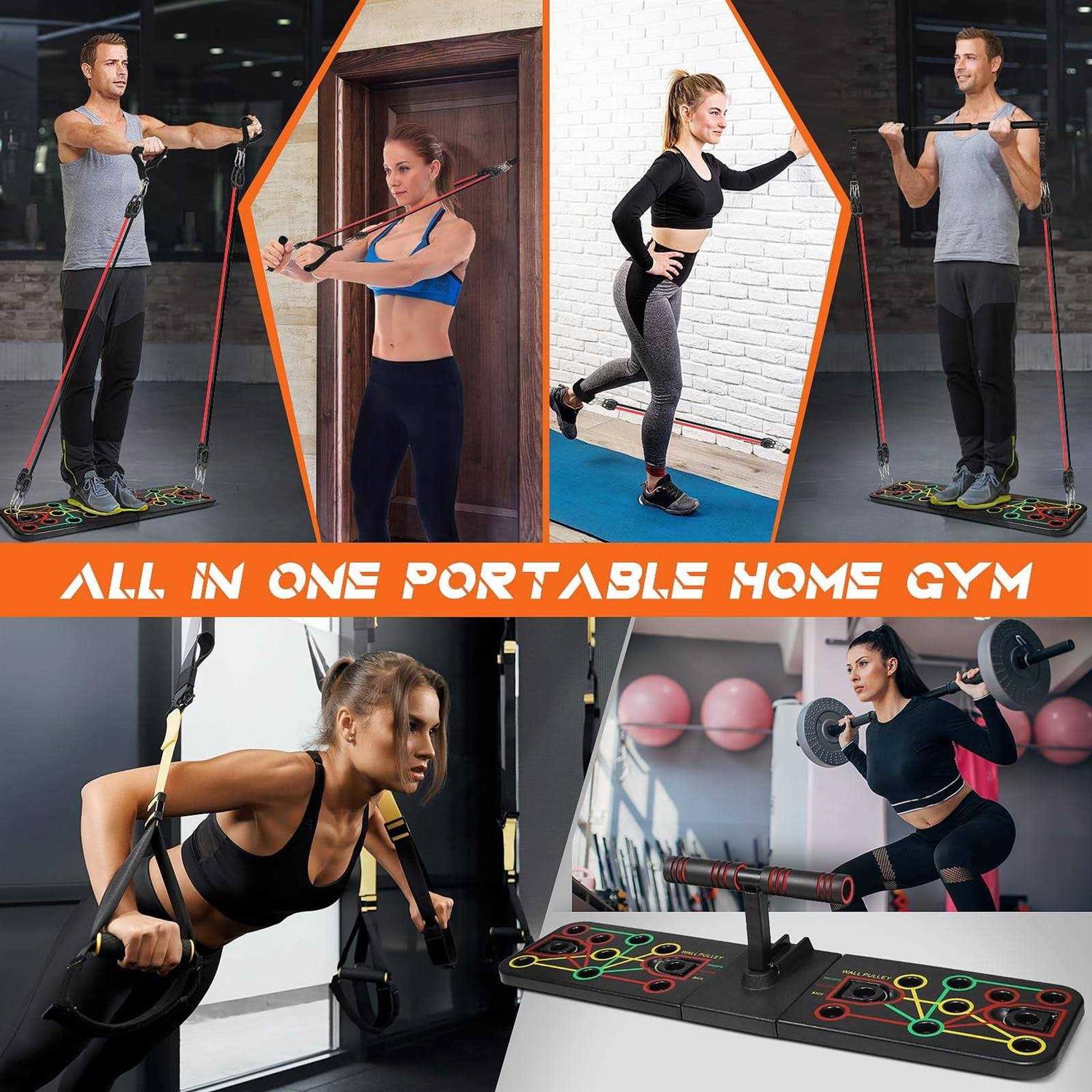 Push Up Board Home Gym Portable System Compact Pilates Bar & 20 Fitness Accessories with Resistance Bands Ab Roller Wheel Strength Training