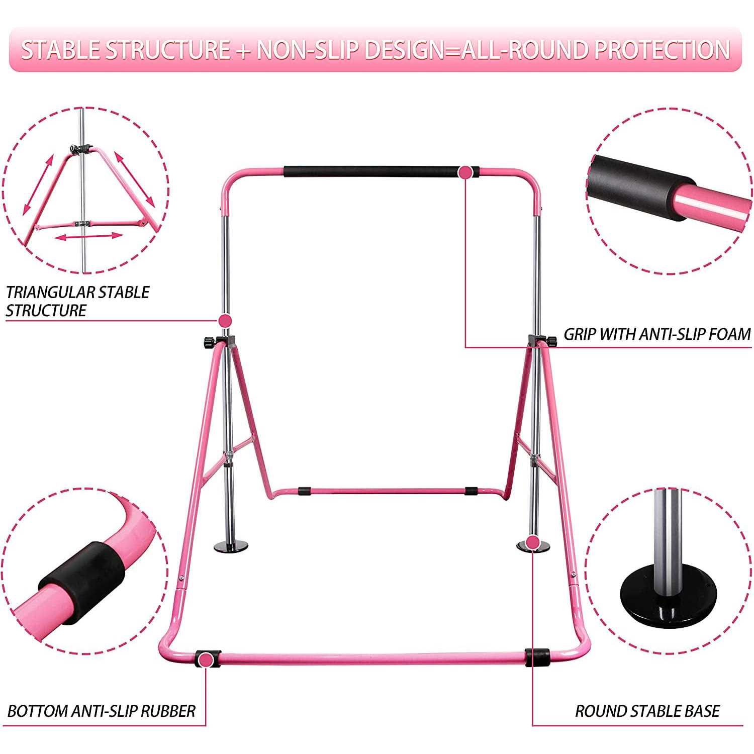 RitFit Foldable Gymnastics Training Bar for Kids, Height Adjustable Kip Bar with 330 lb Capacity for Gymnastics, Streching, Hanging, Pull-Up (Pink),