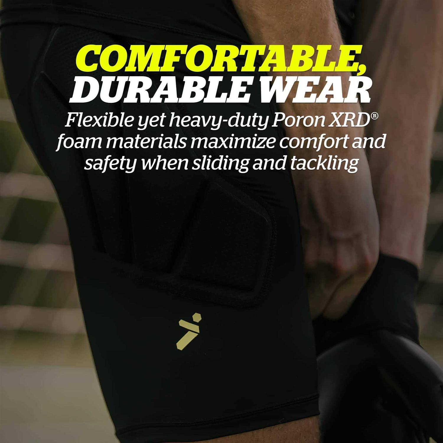 Goalkeeping sliding shorts made for maximum impact and abrasion coverage on the hips and tailbone. New design minimizes bunching and heightens flexibility. Protective against turf burn and play on hard surfaces. 10 mm molded thigh padding. Material absorbs up to 90% of impact. 3 mm stretchy Poron XRD tail bone padding. Lightweight materials wick away moisture for additional breathability. Anti-bacterial treatment reduces odors. Includes front pocket for athletic cup. Fabric 82/18 Nylon/Spandex Padding 100% Urethane Foam.