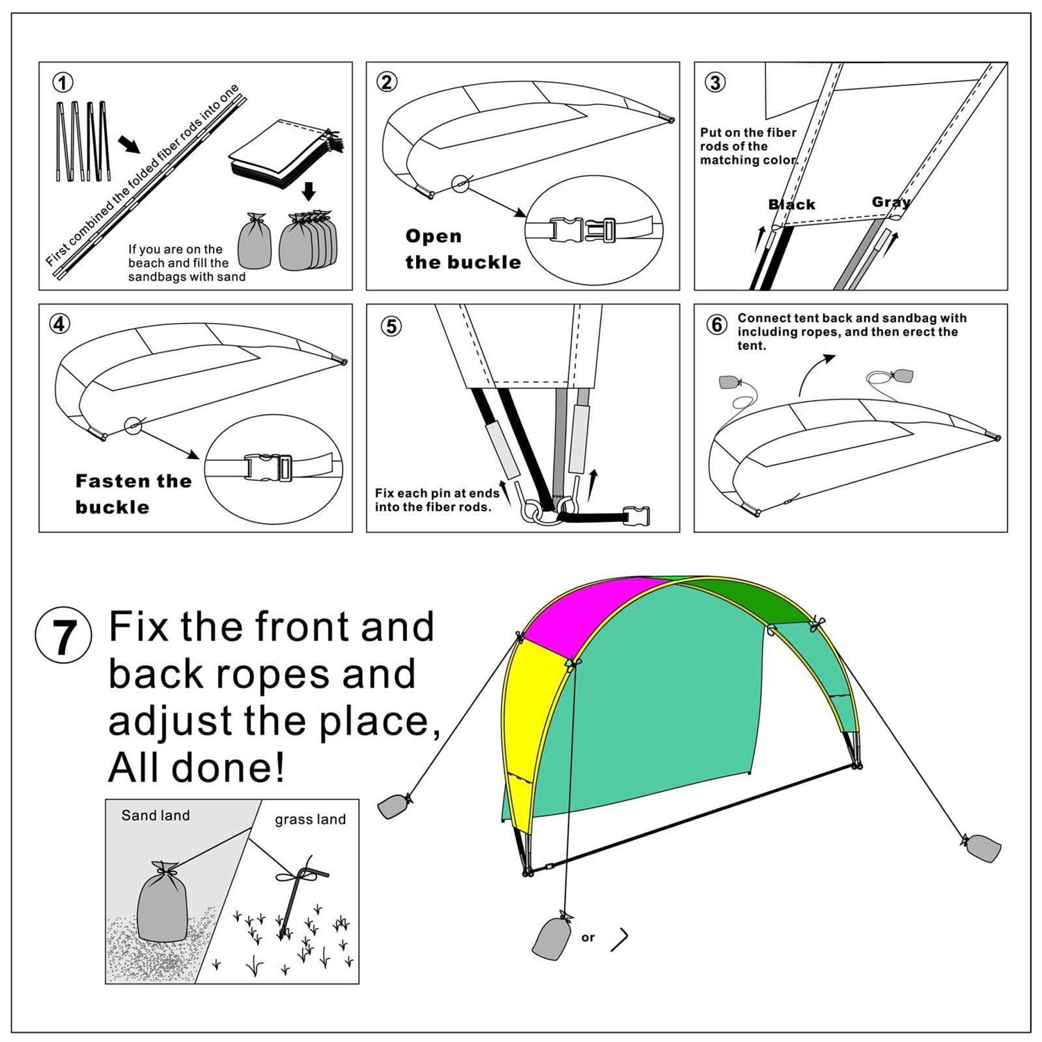 NOTICE: Please do not use it under the strong wind of grade 6. When the wind speed reaches 38.8-49.6km/h, it will affect the stability of the product. It is recommended to evacuate the beach in time. HOW TO USE: On Beach: Filling 4 sand bags and put it on 4 angle side, and use 4 ground nails to fix the fiber rod under sand 10cm too. Cover more sand on sand bags and ground nails to add more weight. Double reinforce the shade tent on beach ! On Grass: Using ground nails to fix the fiber rod is ok to make shade tent steady, if filling sand bags with sand or gravel to put on more weight is definitely sturdy. THE ONLY BEACH TENT In The Whole Market Which Design With The Shape Of A Floating Parachute To Better Resist Wind. Beach Shade Canopy Is Patented And Designed To Be Stably Installed Without Being Deeply Buried In Sand. Double Support Rod Design, Using Folding Fiber Rods With Well Support, The Whole Product Is Stable And Firm, And There Is No Need To Worry About The Problem That The Beach Shelter Is Not Wind-Resistant And The Bracket Is Blown Off. VERSATILE USE —- This Sun Shelter Is Used For Beach, Grass, Patio Shade. Relax On The Beach, Fish By The Lake, Or Enjoy Family Time In The Park. With Great Shading, You Can Set Up Your Awning Almost Anywhere, Or For Outdoor Travel And Recreation, Perfect For Camping, Hiking, Fishing, Picnics Or Weekends Travel. Arch Bridge Design, Heat Dissipation Fabric —- Detailed Instructions, The Supplier For Large Shopping Malls. The Canopy Tent Is Compact And Lightweight After Folded, And It’s Easy To Wash And Dry. There Is Space For 4-6 People And The Outdoor Sunshade Tent Adopts A Multi-Color Splicing Design Style, Which Is A Beautiful Scenery No Matter Where You Are. Due to the different resolutions of the monitors, the actual product may have color differences. Please do not use it under the strong wind of grade 6. When the wind speed reaches 38.8-49.6km/h, it will affect the stability of the product. It is recommended to evacuate the beach in time!